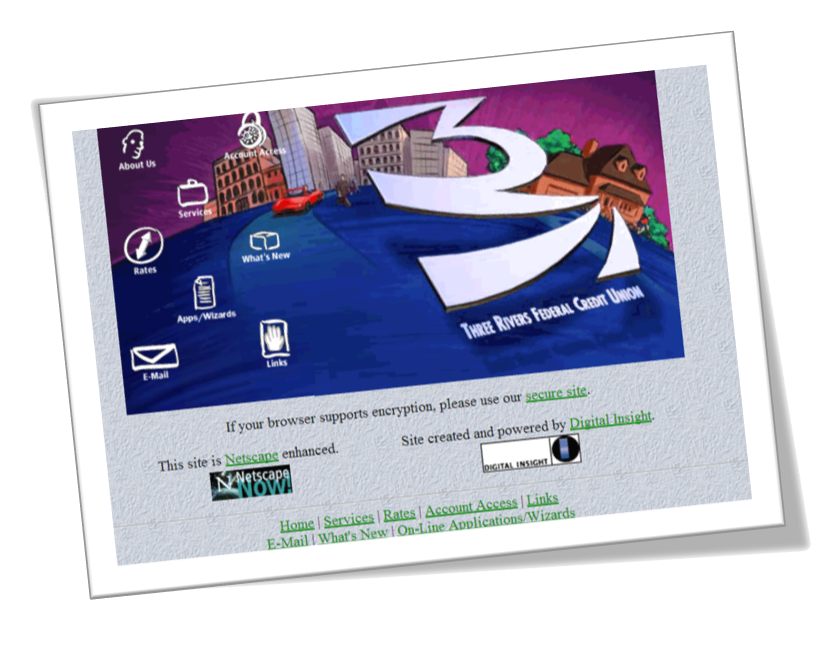 In 1998, the domain 3riversfcu.org was first registered and a website came up soon after. By today's standards, it was simply a digital brochure. Yet for 1998, it was a bit ahead of its time, boasting an image map for easy navigation and online banking for account balance management and bill pay.