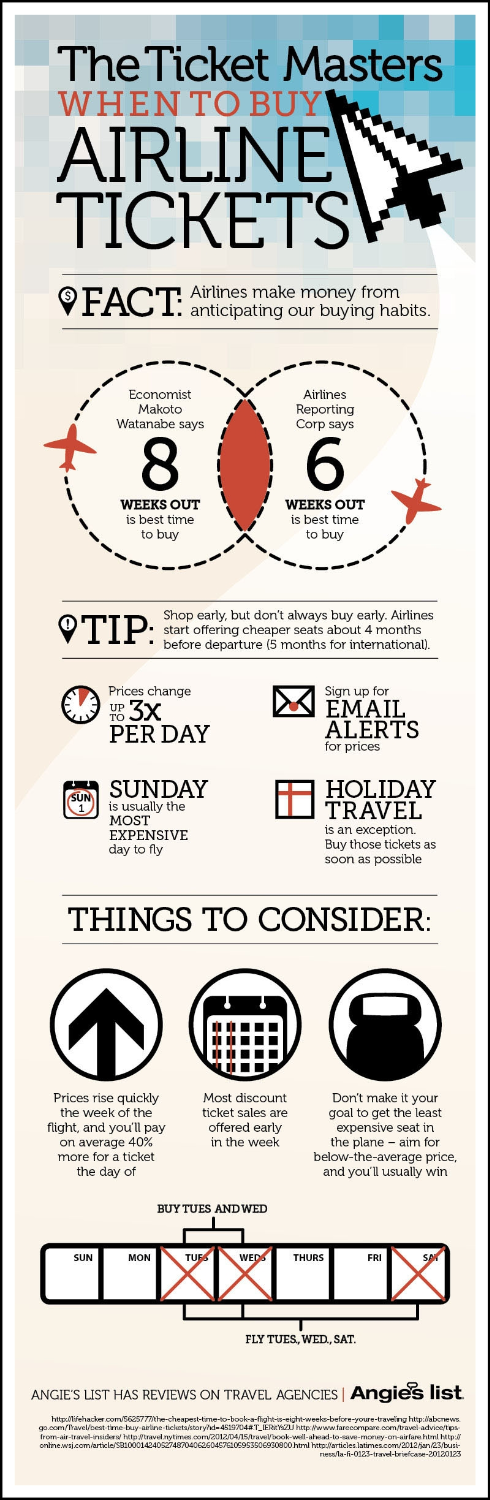 Experts agree that 6 to 8 weeks out is the best time to purchase airline tickets.